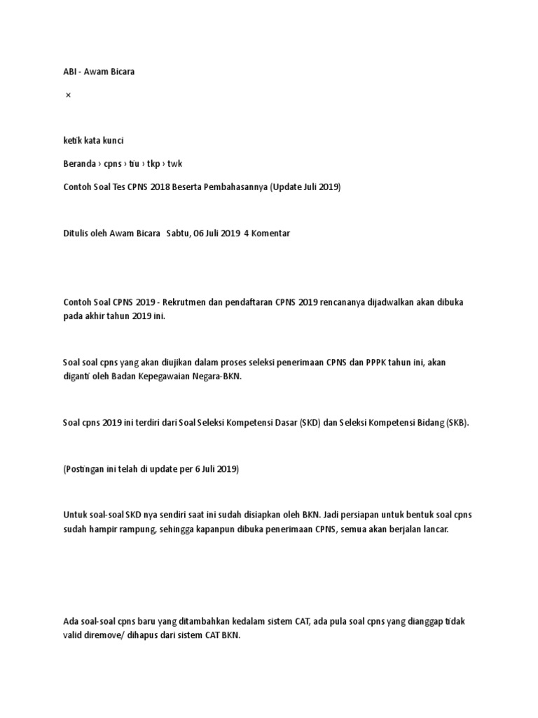 Untuk meningkatkan pemahaman terhadap materi tiu, silahkan pelajari contoh soal tiu dibawah ini ya, karena kunci untuk menghadapi tes tiu ini. Dibawah ini adalah kumpulan soal cpns untuk mempersiapkan diri menghadapi ujian cpns 2018. Akan tetapi, alhamdulillah beberapa instansi sudah mengeluarkan pengumuman mengenai hasil skd. Jumlah soal cat cpns online ini sebanyak 100 soal dengan katagori: Sebagai persiapan menghadapi ujian cat cpns 2019, silahkan kamu pelajari info cpns serta soal soal cpns 2019 dan pembahasannya yang tersedia di.